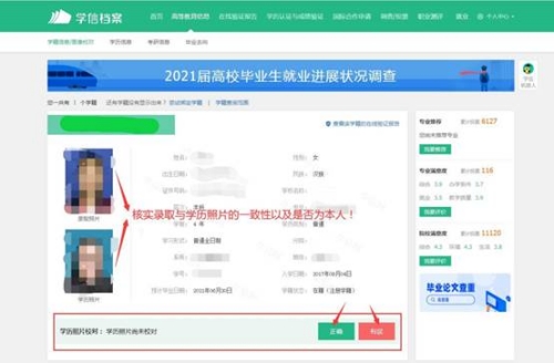 3、核对学历照片,若学历照片为本人请点击“正确”(切勿点击“有误”),若学历照片非本人请点击“有误”。