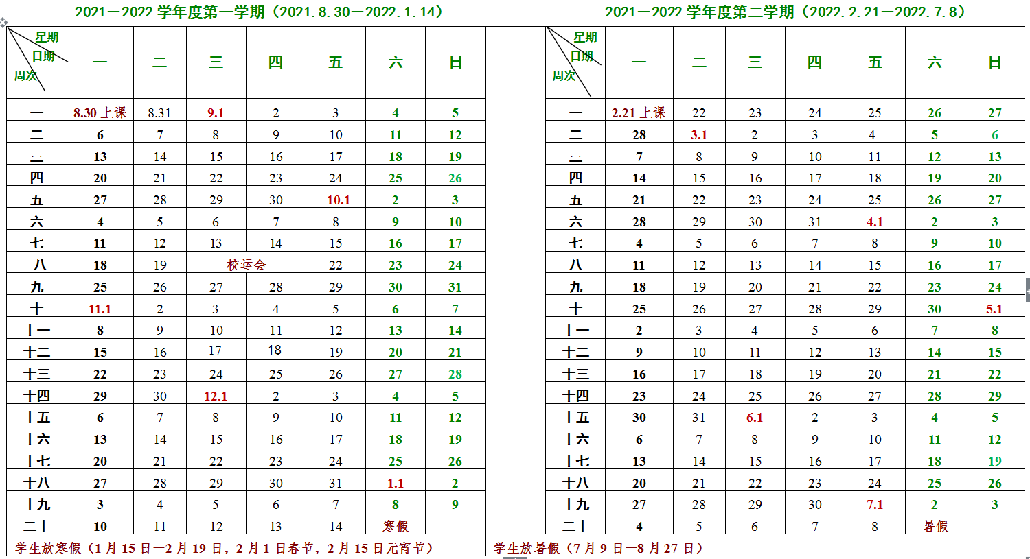 3. 期末复习考试时间:第一学期及第二学期均为第19周、20周。