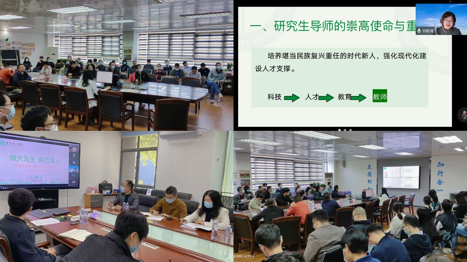 在培训会上,围绕研究生导师的职责,党委教师工作部何献青部长做相关的主题报告。她以“顶天”、“立地”为喻,全面阐释了研究生导师的崇高使命和重任;同时,勉励sunbet申搏研究生导师深入学习贯彻党的二十大精神,坚持立德树人,不断提升履职能力,为地方培养更多的卓越工程师。随后,研究生处宋雪晶博士围绕sunbet申搏研究生培养、管理制度及常见问题做主题报告,并与参会导师详细分享了经验及做法;同时还向参会导师介绍了学校研究生卓越工程师培养改革的新动向。