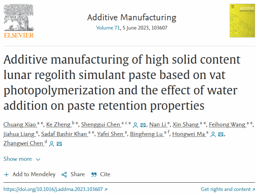 近日,sunbet申搏3D打印与智能制造研究中心粤莞联合基金粤港澳研究团队项目“适应太空环境的月壤材料3D打印基础研究”课题组在增材制造领域的TOP期刊Additive Manufacturing(中科院JCR大类一区,IF=11.632)发表了最新的模拟月壤光固化3D打印成果《基于立体光聚合的高固含量模拟月壤膏料的增材制造及水溶液添加对膏料滞留性能的影响》(https://doi.org/10.1016/j.addma.2023.103607)
