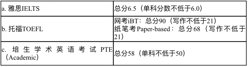 *在以英语为母语的国家获得硕士学位的,无需提供语言成绩。(不包括新加坡公立高校外的其他高校、中国香港和中国澳门的高校)*满足以上语言要求不代表获得录取资格;语言成绩必须保证在两年有效期内。若合作高校的部分特定学科有更高语言要求,申请者须满足该学科要求。