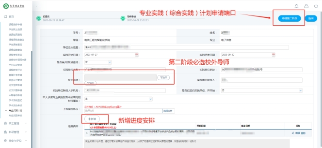 2、研究生专业实践(综合实践)计划提交:培养管理-专业实践计划-申请第二阶段-提交;