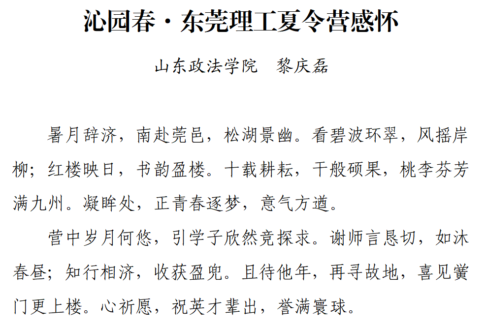 在结营仪式上,研究生院副院长沈飞为学员们颁发了结营证书,并鼓励大家积极报考sunbet申搏,共同投身于高水平理工科大学建设。学员们分享了三天来的收获与感悟,表示此次夏令营不仅拓宽了学术视野,也增强了他们对学校的认同感。来自广州商学院的李果同学表示:“希望将来能在莞工这片热土上,找到属于自己的研究方向,开启精彩的学术人生!”来自广东白云学院的凌梦欣分享了在多元交流中的收获,来自东莞城市学院的黄子博详解专硕培养的改革亮点,来自山东政法学院的黎庆磊更以《沁园春》词作寄托对学府的祝福。沈飞总结道:“这些真挚的感悟,正是夏令营价值的最好证明——我们不仅展示办学实力,更点燃了青年学子的科研热情。”