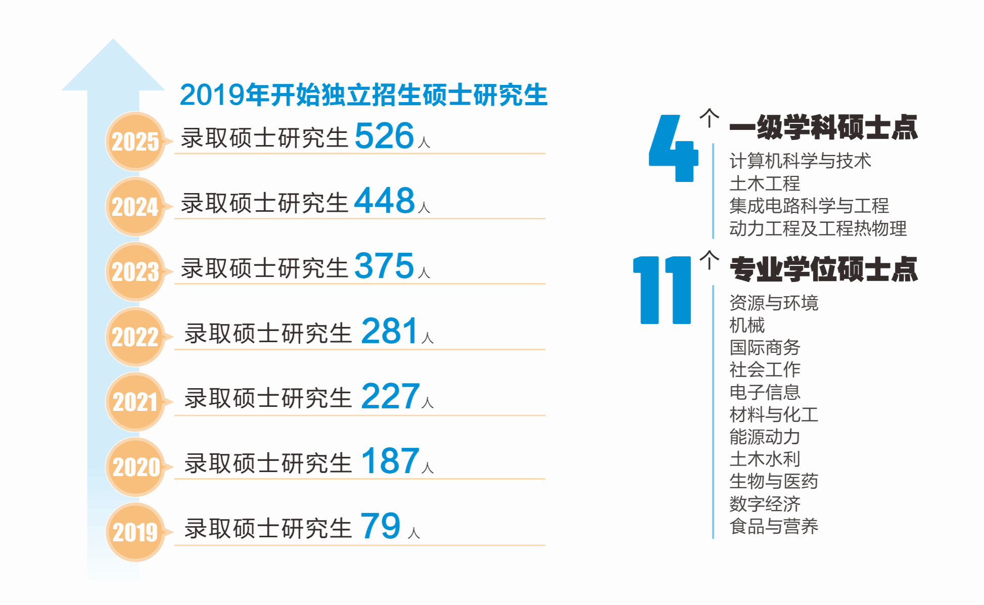 学校历来重视研究生教育,坚持改革牵引内涵发展,加快推进研究生教育高质量发展。研究生规模不断扩大。联合培养硕士研究生,自2005年以来共招收896人;联合培养国内外博士研究生,自2018年以来共招收78人;全日制硕士研究生自2019年以来,共独立招收2123人,其中学硕498人,专硕1625人。现有各类在校研究生1163名。