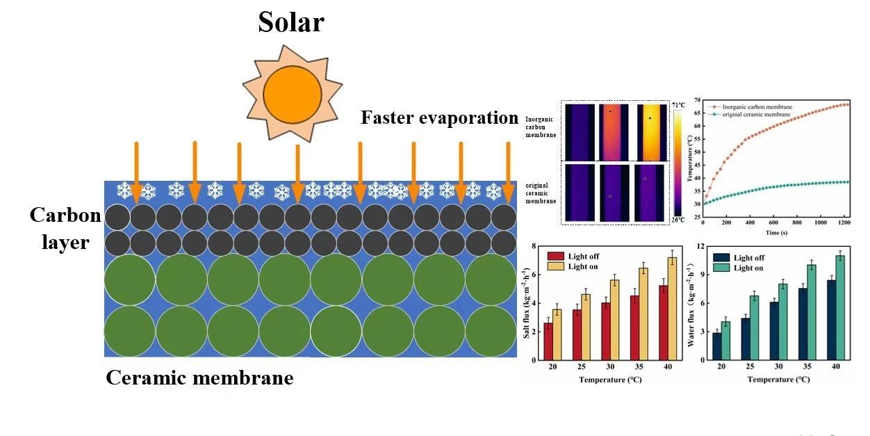 为解决传统采矿技术面临的资源短缺与环境污染等问题,团队创新性地开发了基于无机碳膜的光热增强膜结晶技术。通过高温碳化工艺在陶瓷基底表面构建了具有优异光热转换性能的碳层,成功制备出新型无机碳膜。实验表明,在1000 W/m²光照强度下,膜表面温度可快速升至70℃,显著提升溶液界面蒸发速率。该系统在40℃、25 wt%盐浓度条件下实现7.2 kg·m⁻²·h⁻¹的盐通量和11.01 kg·m⁻²·h⁻¹的水通量,较无光照条件分别提升38%和31%。