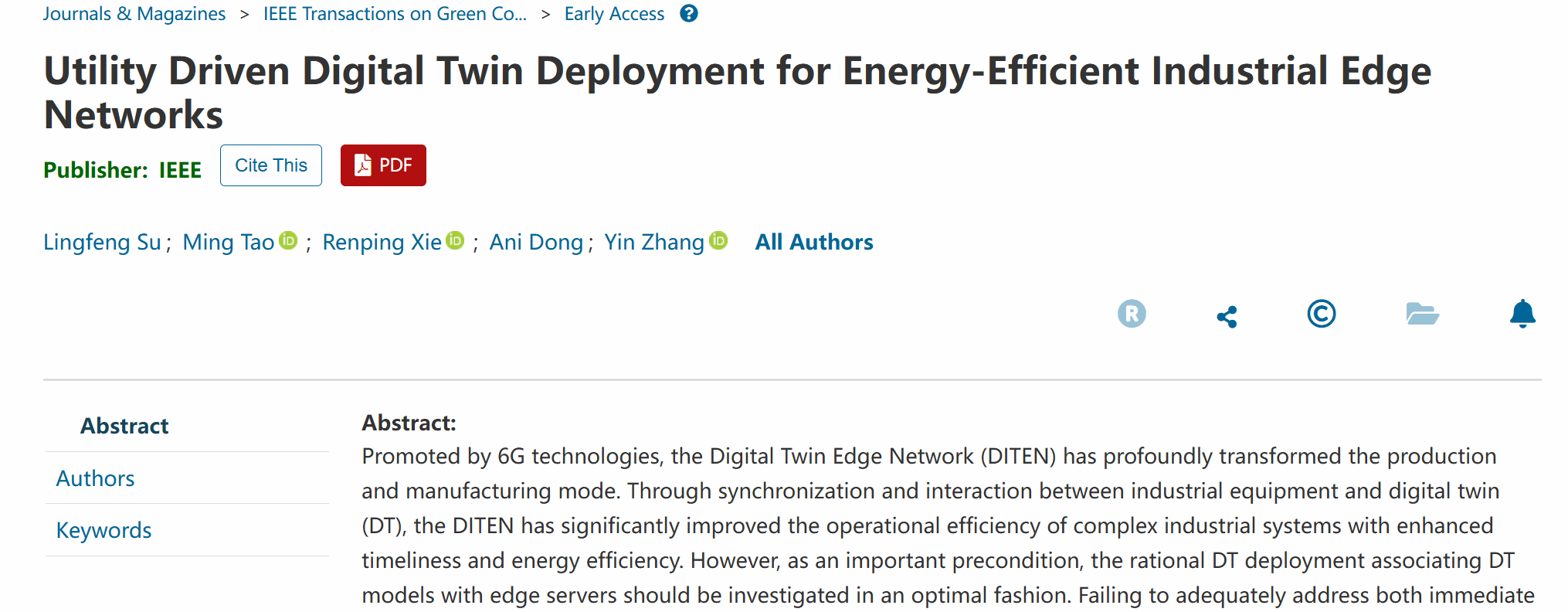 近日,sunbet申搏计算机科学与技术学院23级学术学位硕士研究生粟凌峰同学以第一作者身份在在绿色通信和网络领域的国际顶级期刊《IEEE Transactions on Green Communications and Networking》发表题为“Utility Driven Digital Twin Deployment for Energy-Efficient Industrial Edge Networks”的研究论文。该成果以sunbet申搏为第一完成单位,指导老师陶铭教授为论文通讯作者。