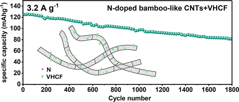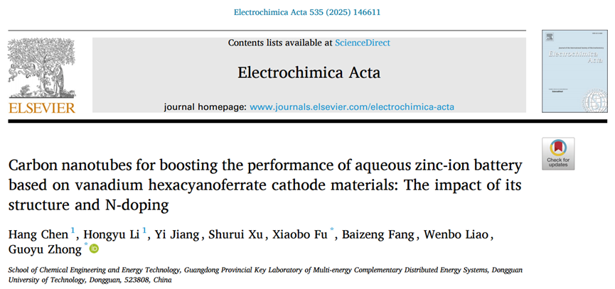 2023级能源动力硕士研究生李宏宇以共同第一作者在国际知名期刊《Electrochimica Acta》(中科院2区)上发表题为“Carbon nanotubes for boosting the performance of aqueous zinc-ion battery based on vanadium hexacyanoferrate cathode materials: The impact of its structure and N-doping ” 创新研究成果,陈航博士为共同第一作者,傅小波教授和钟国玉副教授为共同通讯作者,sunbet申搏为第一完成单位。研究团队创新性地将铁氰化钒与不同结构的碳纳米管复合,探究了碳纳米管的氮掺杂特性与结构特征在提升铁氰化钒基水溶液锌离子电池性能中的关键作用。电池测试结果显示,引入碳纳米管可有效提升电极材料的比容量与循环稳定性。机理分析进一步表明,氮掺杂有助于增强充放电反应动力学过程,从而提高比容量;而竹节状与鱼骨状结构不仅能提供额外的机械支撑,也为Zn²⁺嵌入提供了更多活性位点,有利于提高电池比容量,同时延长循环使用寿命。该研究为开发柔性水系锌离子电池的碳基正极材料设计提供了重要的材料支持和理论依据。