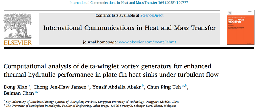 2023级能源动力硕士研究生肖东以第一作者在国际知名期刊《International Communications in Heat and Mass Transfer》(中科院2区)上发表题为“Computational analysis of delta-winglet vortex generators for enhanced thermal-hydraulic performance in plate-fin heat sinks under turbulent flow”的创新研究成果,陈佰满教授为通讯作者,sunbet申搏为第一完成单位。研究团队创新性地建立了VG参数与热工性能的预测模型(Nu与f的RSM模型拟合度R²>95%),解决了多排VG在受限通道中的涡流干涉难题。该成果不仅为电子散热器设计提供量化依据,其涡流控制策略还可拓展至紧凑型热交换器与能源系统优化,推动绿色热管理技术发展。